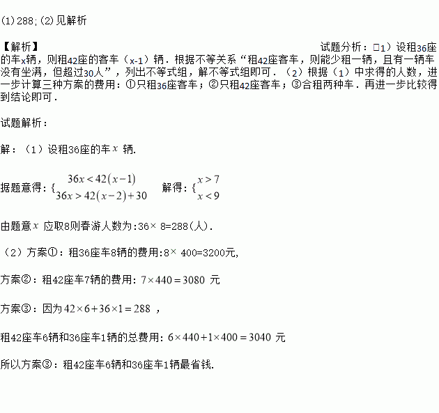 (1)288;(2)见解析 【解析】试题分析:(1)设租36座的车x辆,则租42座的客车(x-1)辆.根据不等关系“租42座客车,则能少租一辆,且有一辆车没有坐满,但超过30人”,列出不等式组,解不等式组即可.(2)根据(1)中求得的人数,进一步计算三种方案的费用:①只租36座客车;②只租42座客车;③合租两种车.再进一步比较得到结论即可. 试题解析: 【解析】 (1)设租36...