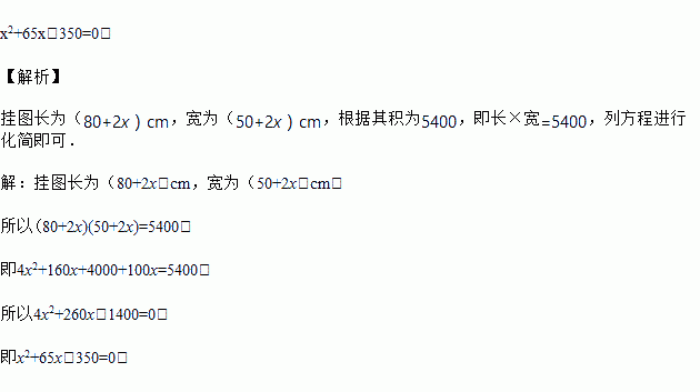 如图所示,在一幅长80cm,宽50cm的矩形风景画的四周镶一条金色纸边,制成一幅矩形挂图,如果要使整个挂图的面积是5400cm2 , 设金色纸边的宽为xcm,求满足x的方程.