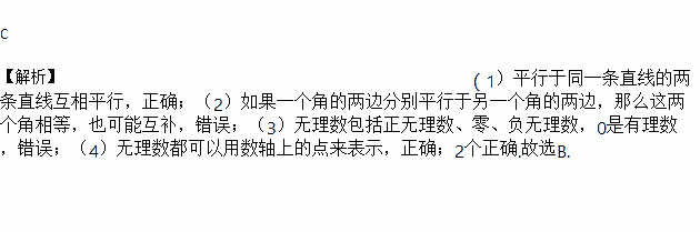 有下列说法:(1)平行于同一条直线的两条直线互相平行;(2)如果一个角的两边分别平行于另一个角的两边,那么这两个角相等;(3)无理数包括正无理数、零、负无理数;(4)无理数都可以用数轴上的点来表示.其中正确的说法的个数是( )