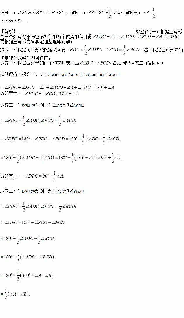 已知:如图3,在四边形ABCD中,DP,CP分别平分∠ADC和∠BCD,试利用上述结论探究∠P与∠A+∠B的数量关系.