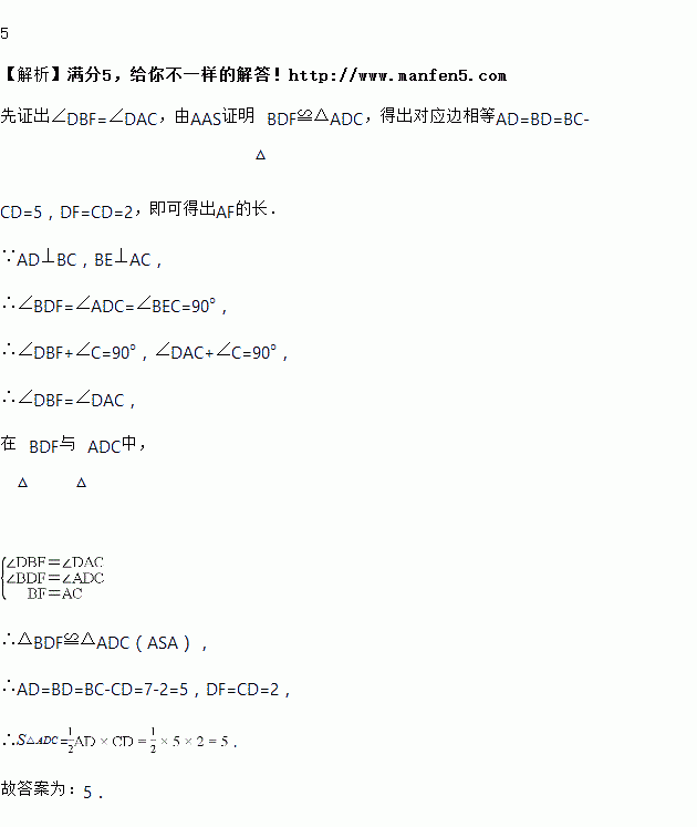 如图,锐角△ABC的高AD,BE相交于F,若BF=AC,BC=7,DF=2,则S△ADC = ________.