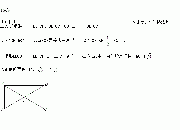 若矩形的对角线长为8cm,两条对角线的一个交角为60°,则该矩形的面积为__cm2
