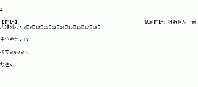A 【解析】试题解析:将数据从小到大排列为:8,9,10,11,12,14,16,16,17,19, 中位数为:13; 极差=19?8=11. 故选A.