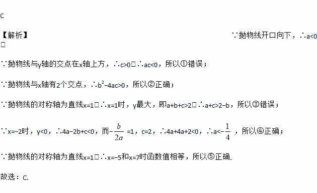 C 【解析】∵抛物线开口向下,∴a<0, ∵抛物线与y轴的交点在x轴上方,∴c>0,∴ac<0,所以①错误; ∵抛物线与x轴有2个交点,∴b2?4ac>0,所以②正确; ∵抛物线的对称轴为直线x=1,∴x=1时,y最大,即a+b+c>2,∴a+c>2?b,所以③错误; ∵x=?2时,y<0,∴4a?2b+c<0,而?=1,c=2,∴4a+4a+2<0,∴a,所以④...(2016重庆市)从﹣3,﹣1,