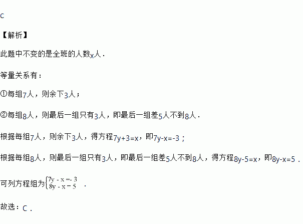 某班有x人,分y组活动,若每组7人,则余下3人;若每组8人,则最后一组只有3人.求全班人数,下列方程组中正确的是( )