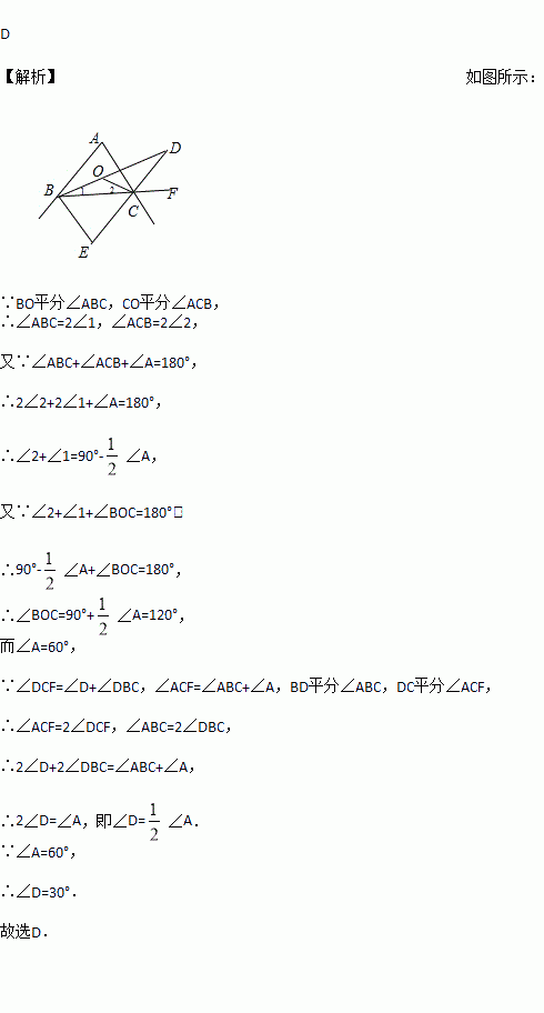 在△ABC中,∠B,∠C的平分线交于点O,D是外角与内角平分线交点,E是外角平分线交点,若∠BOC=120°,则∠D=( )