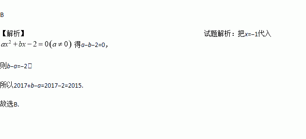 若x=﹣1是关于x的一元二次方程ax2+bx﹣2=0(a≠0)的一个根,则代数式2017+b﹣a的值等于( )