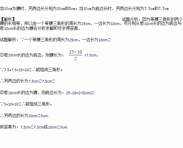 一个等腰三角形的周长为25cm,其中一边长为10cm,求另两边的长