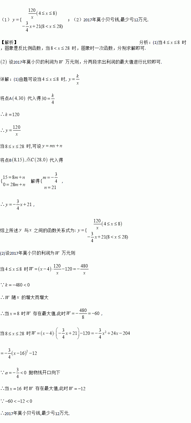 (2)若莫小贝购商铺及装修一共花了120万元,请通过计算说明2017年莫小贝是赚还是亏?若赚,最多赚多少元?若亏,最少亏多少元?