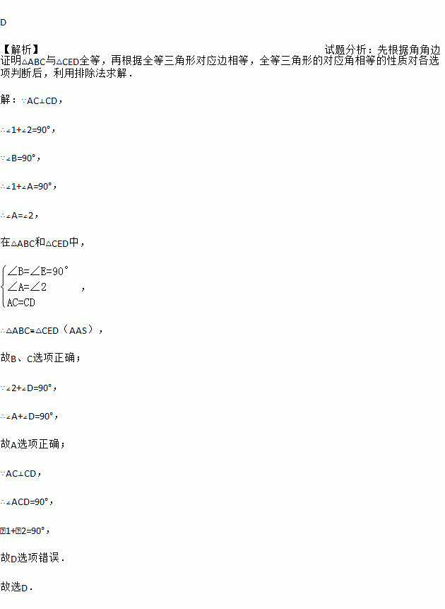 已知:如图所示,B、C、D三点在同一条直线上,AC=CD,∠B=∠E=90°,AC⊥CD,则不正确的结论是( )