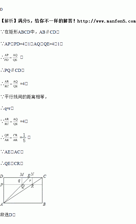 如图的矩形ABCD中,E点在CD上,且AE<AC.若P、Q两点分别在AD、AE上,AP:PD=4:1,AQ:QE=4:1,直线PQ交AC于R点,且Q、R两点到CD的距离分别为q、r,则下列关系何者正确?( )