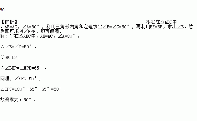 如图,在△ABC中,AB=AC,∠A=80°,E,F,P分别是AB,AC,BC边上一点,且BE=BP,CP=CF,则∠EPF= 度.