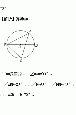 如图,点A、B、C、D分别是⊙O上四点,∠ABD=20°,BD是直径,则∠ACB= 。