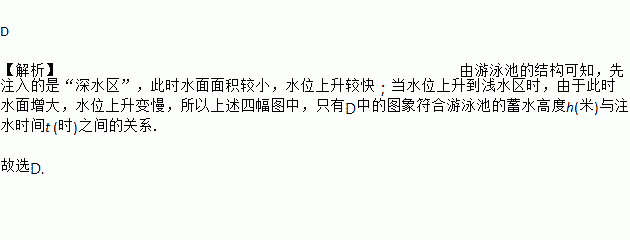 如图所示的是一游泳池断面图,分为深水区和浅水区,排空池里的水进行清理后,打开进水阀门连续向该池注水(此时已关闭排水阀门).则游泳池的蓄水高度h(米)与注水时间t (时)之间的关系的大致图象是 ( )