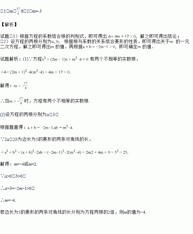(2)若边长为的菱形的两条对角线的长分别为方程两根的2倍,求m的值.