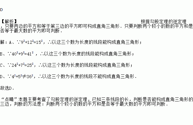 A. 9、12、15 B. 41、40、9 C. 25、7、24 D. 6、5、4