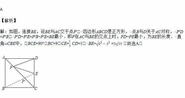 如图,在正方形ABCD中,AB=9,点E在CD边上,且DE=2CE,点P是对角线AC上的一个动点,则PE+PD的最小值是( )