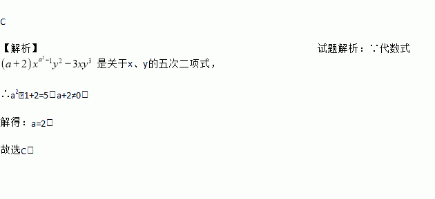 C 【解析】试题解析:∵代数式是关于x、y的五次二项式, ∴a2﹣1+2=5,a+2≠0, 解得:a=2. 故选C.