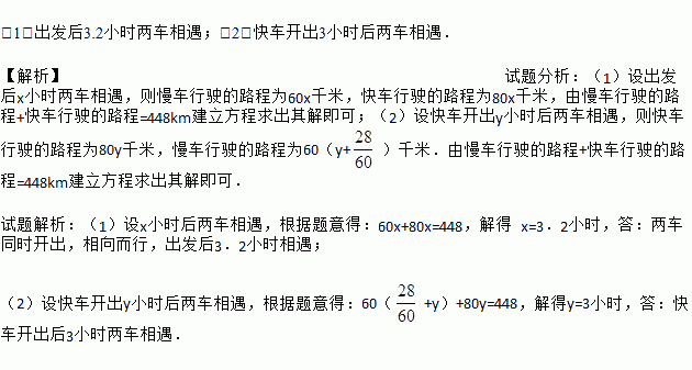 (1)出发后3.2小时两车相遇;(2)快车开出3小时后两车相遇. 【解析】试题分析:(1)设出发后x小时两车相遇,则慢车行驶的路程为60x千米,快车行驶的路程为80x千米,由慢车行驶的路程+快车行驶的路程=448km建立方程求出其解即可;(2)设快车开出y小时后两车相遇,则快车行驶的路程为80y千米,慢车行驶的路程为60(y+)千米.由慢车行驶的路程+快车行驶的路程=448km建立方程求出其...