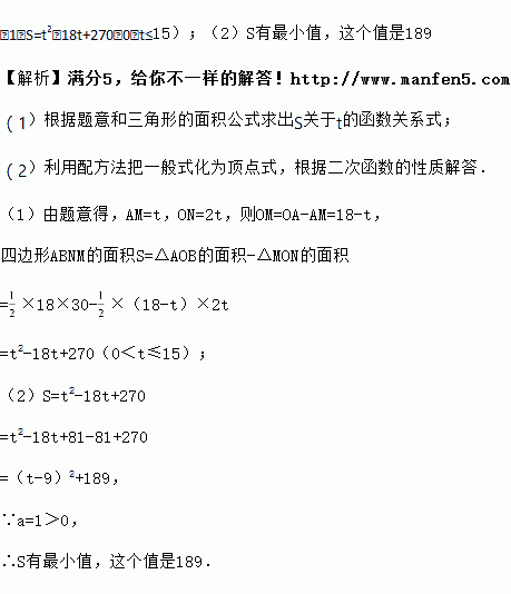 如图,在△AOB中,∠O=90°,AO=18cm,BO=30cm,动点M从点A开始沿边AO以1cm/s的速度向终点O移动,动点N从点O开始沿边OB以2cm/s的速度向终点B移动,一个点到达终点时,另一个点也停止运动.如果M、N两点分别从A、O两点同时出发,设运动时间为ts时四边形ABNM的面积为Scm2.