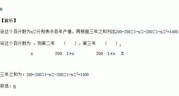 某公司今年一月产值200万元,现计划扩大生产,使今后两年的产值都比前一年增长一个相同的百分数,这样三年(包括今年)的总产值就达到了1400万元.设这个百分数为x,则可列方程为( )