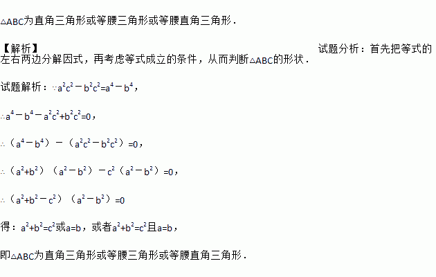 已知a,b,c为△ABC的三边,且满足a2c2﹣b2c2=a4﹣b4 , 试判定△ABC的形状.