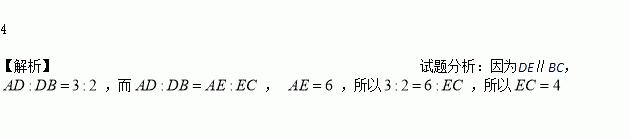 如图,在△ABC中,点D、E分别在AB、AC边上,且 DE∥BC,若AD∶DB=3∶2,AE=6,则EC的长等于_______.