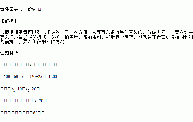 百货大楼服装柜在销售中发现:某品牌童装每件成本元,现以每件元销售,平均每天可售出件.为了迎接“五•一”劳动节,商场决定采取适当的降价措施,以扩大销售量,增加盈利,尽量减少库存.经市场调查发现:如果每件童装降价元,那么平均每天就可多销售件.要想平均每天销售这种童装盈利元,请你帮商场算一算,每件童装应定价多少元?
