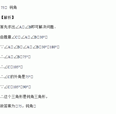 在△ABC中,∠C比∠A+∠B还大30°,则∠C的外角为______度,这个三角形是______三角形。