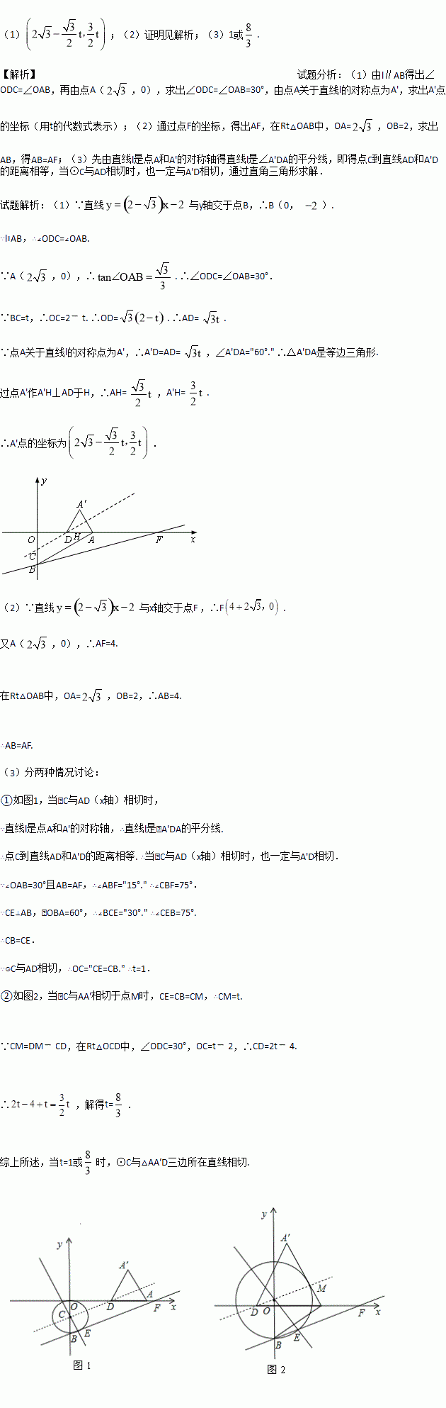 )x-2于点E,以点C为圆心CE为半径作⊙C,求当t为何值时,⊙C与△AA′D三边所在直线相切?