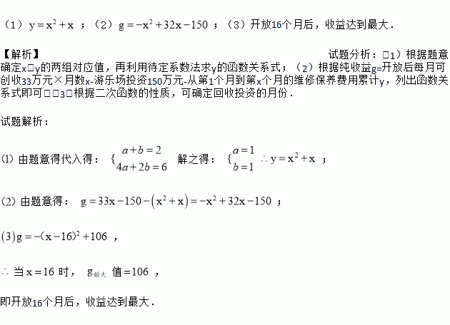 济宁市全运会会期间,邹城市投资150万元引进一项大型游乐设施.若不计维修保养费用,预计开放后每月可创收33万元.而该游乐设施开放后,从第1个月到第x个月的维修保养费用累计为y(万元),且y=ax2+ bx;若将创收扣除投资和维修保养费用 称为游乐场的纯收益g(万元),g也是关于 x的二次函数;