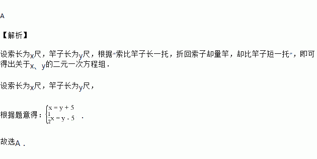 我国古代数学著作《增删算法统宗》记载”绳索量竿”问题:“一条竿子一条索,索比竿子长一托.折回索子却量竿,却比竿子短一托“其大意为:现有一根竿和一条绳索,用绳索去量竿,绳索比竿长5尺;如果将绳索对半折后再去量竿,就比竿短5尺.设绳索长x尺,竿长y尺,则符合题意的方程组是( )