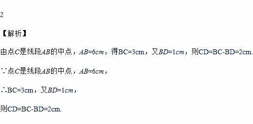 如图,点C是线段AB的中点,AB=6cm,如果点D是线段AB上一点,且BD =1cm,那么CD =_________cm.