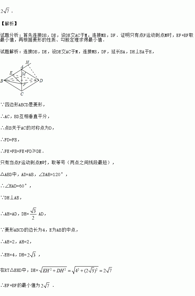如图,菱形ABCD的边长为4,∠BAD=120°,点E是AB的中点,点F是AC上的一动点,则EF+BF的最小值是 .