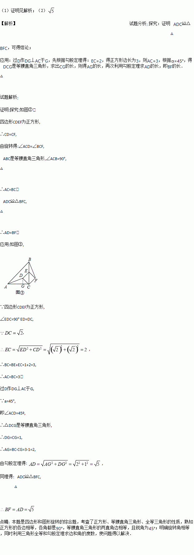 探究:将图①的正方形CDEF绕点C顺时针旋转α(0°<α<90°),连接AD、BF,其他条件不变,如图②,求证:AD=BF;