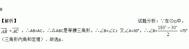 如图所示,在⊙O中, =,∠A=30°,则∠B=( )