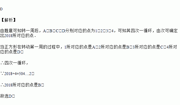 正方形ABCD在数轴上的位置如图所示,点D、A对应的数分别为0和1,若正方形ABCD绕着顶点顺时针方向在数轴上连续翻转,翻转1次后,点B所对应的数为2;则翻转2018次后,数轴上数2018所对应的点是( )