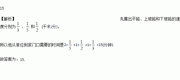 王老师从家门口骑车去单位上班,先走平路到达A地,再上坡到达B地,最后下坡到达工作单位,所用的时间与路程的关系如图所示.若王老师下班时,还沿着这条路返回家中,回家途中经过平路、上坡、下坡的速度不变,那么王老师回家需要的时间是________________分钟.