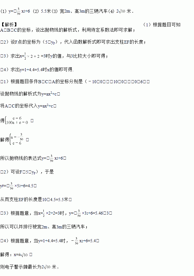 (4)拱桥下方要悬挂宽为1米的电子警示牌,要求警示牌下底距地面不能少于4.4m,则电子警示牌最长为多长?