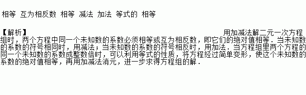 用加减法解二元一次方程组时,两个方程中同一个未知数的系数必须________或_______,即它们的绝对值______.当未知数的系数的符号相同时,用_______;当未知数的系数的符号相反时,用_______.当方程组里两个方程的同一个未知数的系数成整数倍时,可以利用________性质,将方程经过简单变形,使这个未知数的系数的绝对值________,再用加减法消元,进一步求得方程组的解.
