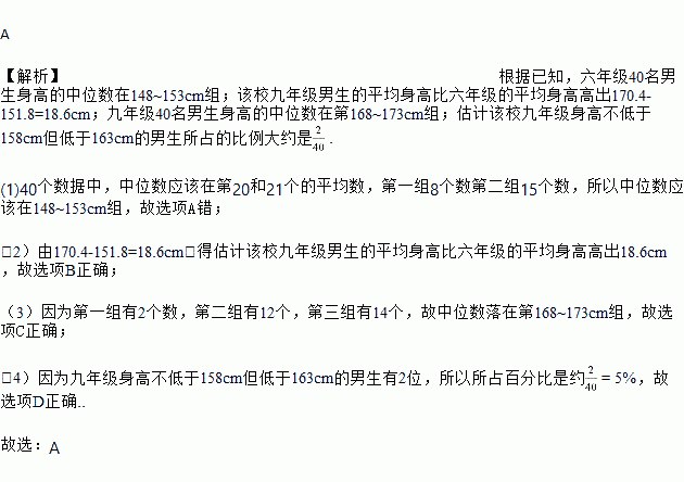 A. ÁùÄê¼¶40ÃûÄÐÉúÉí¸ßµÄÖÐλÊýÔÚµÚ153~158cm×é