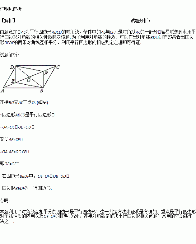 如图,□ABCD中,点E、F在对角线AC上,且AE=CF。求证:四边形BEDF是平行四边形。