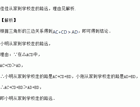 如图,佳佳和音音住在同一小区(A点),每天一块去学校(B点)上学.一天,佳佳要先去文具店(C点)买练习本再去学校,音音要先去书店(D点)买书再去学校.这天两人从家到学校谁走的路远?为什么?