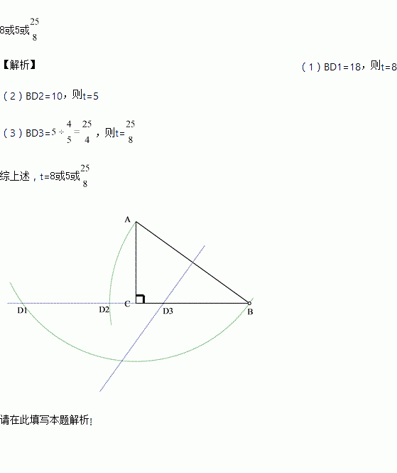 在Rt△ABC中,∠C=90°,BC=8cm,AC=6cm,在射线BC上一动点D,从点B出发,以2厘米每秒的速度匀速运动,若点D运动t秒时,以A、D、B为顶点的三角形恰为等腰三角形,则所用时间t为______________________秒。