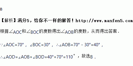 如图所示,已知∠AOC=∠BOD=70°,∠BOC=30°,则∠AOD的度数为( )