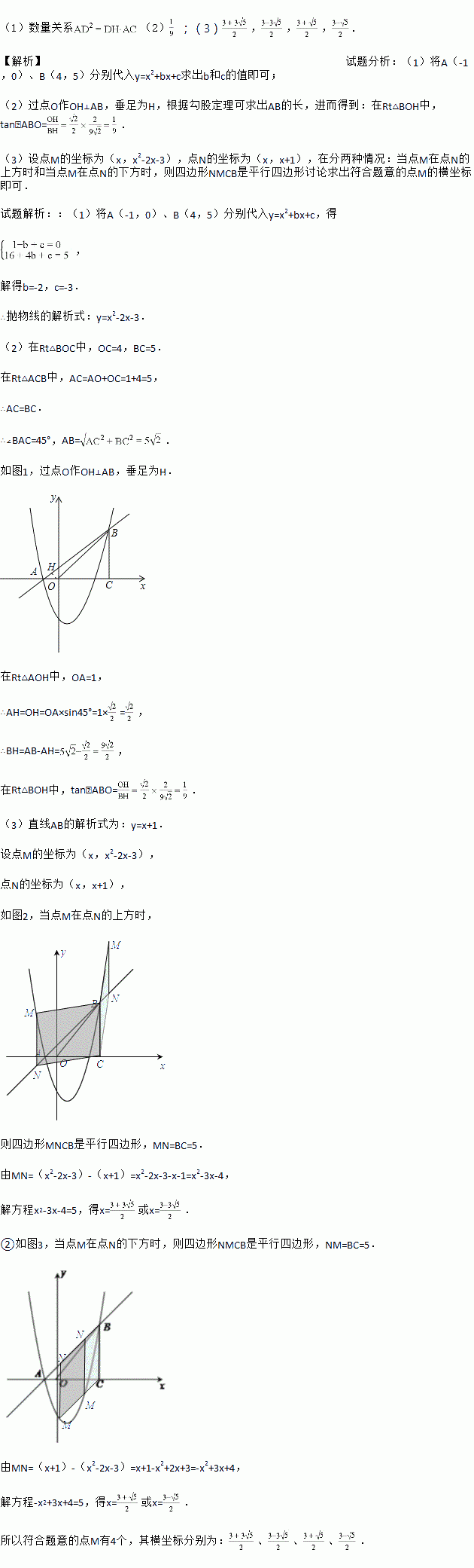 (3)点M是抛物线上的一个点,直线MN平行于y轴交直线AB于N,如果以M、N、B、C为顶点的四边形是平行四边形,求出点M的横坐标.