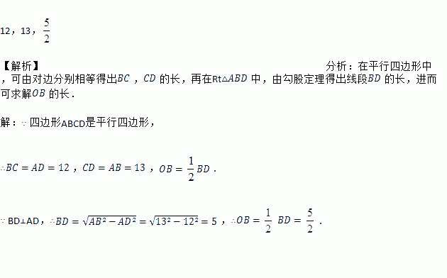 如图,四边形ABCD是平行四边形,BD⊥AD,求BC,CD及OB的长.