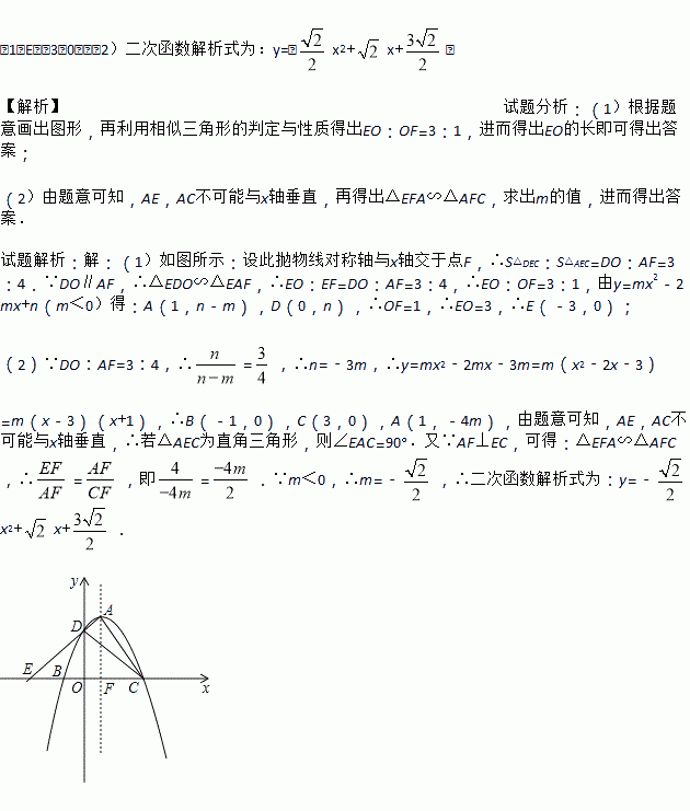 在平面直角坐标系xOy中,抛物线y=mx2﹣2mx+n(m<0)的顶点为A,与x轴交于B,C两点(点B在点C左侧),与y轴正半轴交于点D,连接AD并延长交x轴于E,连AC、DC.S△DEC:S△AEC=3:4.