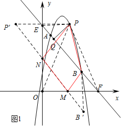 £¨2£©Èçͼ1£¬Ö±ÏßABÉÏ·½µÄÅ×ÎïÏßÉÏÓÐÒ»µãP£¬¹ýµãP×÷PQ´¹Ö±ÓÚABËùÔÚÖ±Ïߣ¬´¹×ãΪQ£¬ÔÚxÖáÕý°ëÖáºÍyÖáÕý°ëÖáÉÏ·Ö±ðÓÐÁ½¸ö¶¯µãMºÍN£¬Á¬½ÓPN£¬NM£¬MB£¬BP£®µ±Ïß¶ÎPQµÄ³¤¶È×î´óʱ£¬ÇóËıßÐÎPNMBÖܳ¤µÄ×îСֵ£®