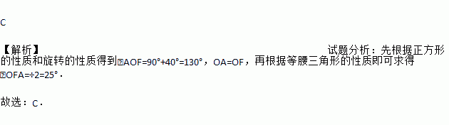 如图,正方形OABC绕着点O逆时针旋转40°得到正方形ODEF,连接AF,则∠OFA的度数是( ).